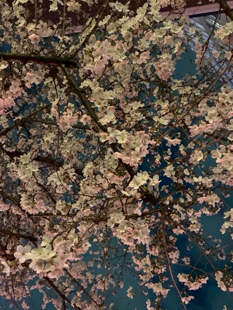 藍色の空を見上げると そこには白とピンクのライト 奥にそびえる無機質なビルでさえ舞台の一部になる 春の夜の桜の見事な舞台仕掛け -